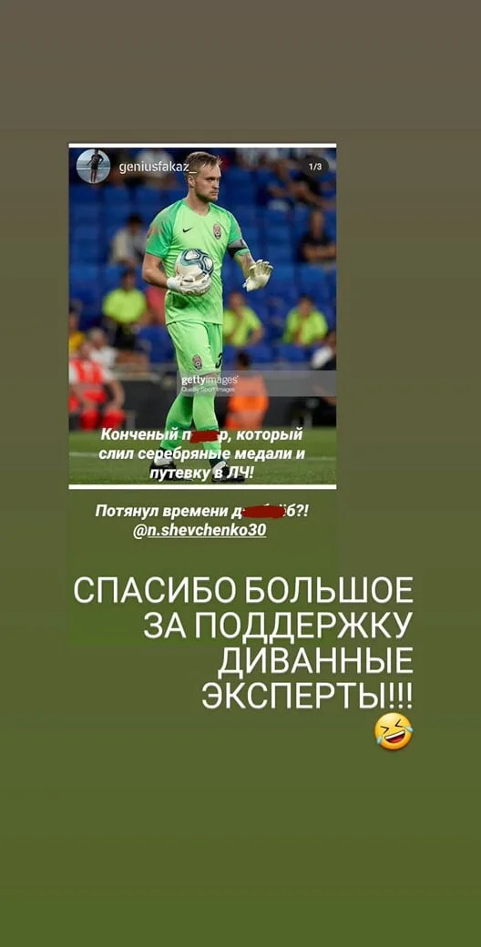"Большое спасибо за поддержку, диванные эксперты", – коротко ответил голкипер в своей Instagram-сторис.