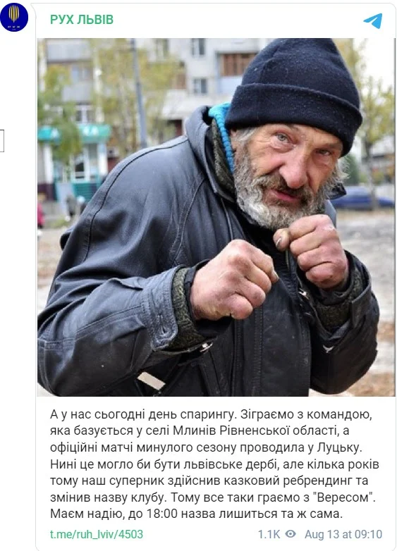 Началось все с анонса товарищеского матча в Telegram-канале Руха, где начали насмехаться над историей многолетней давности, когда Верес поднялся в УПЛ, фактически поменявшись местами со Львовом: "Надеемся, до 18:00 название останется то же самое". Львовяне также прикрепили фотографию бездомного, издеваясь над тем, что Верес не играет на родном стадионе.