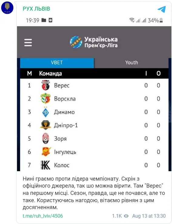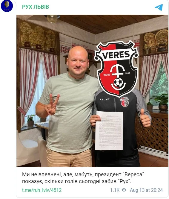 После этого Рух выложил скриншот турнирной таблицы УПЛ, где Верес расположился на первом месте по алфавитному порядку, и поздравил ровенцев с "достижением". На этом львовяне не остановились и посмеялись над фотографией президента Вереса Ивана Надеина, который, по их словам, "показывает, сколько голов сегодня забил Рух" (в игре с Вересом – прим.)