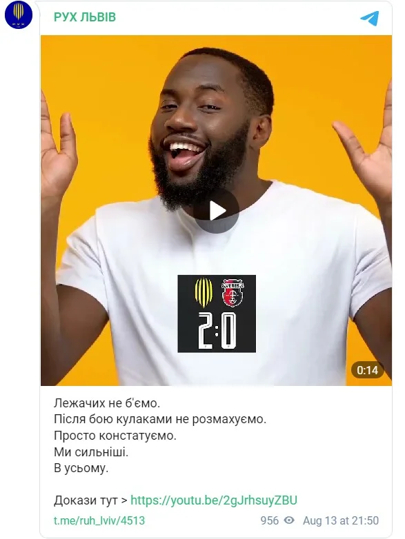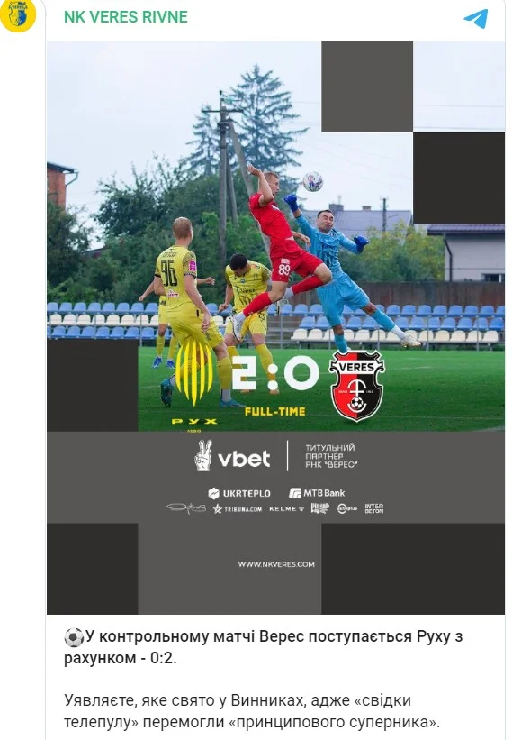 Завершилось это очередной корреспонденцией с манией величия – Рух поделился ссылкой на обзор игры, написав, что "они сильнее во всем". Верес спокойно отреагировал на эти нападки в посте, посвященном результату встречи: "Представляете, какой праздник в Винниках, ведь "свидетели телепула" победили "принципиального соперника".