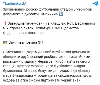 "Германия и дортмунский клуб готовы помочь восстановить разрушенный российскими оккупационными войсками стадион в Чернигове. Клуб помнит своего игрока и крутого украинского футболиста Андрея Ярмоленко. Со своей стороны, мы присоединяем к диалогу мэра Владислава Атрошенко и надеемся, что это замечательное известие сможет поддержать черниговчан", – написал Ткаченко в своем Telegram-канале.
