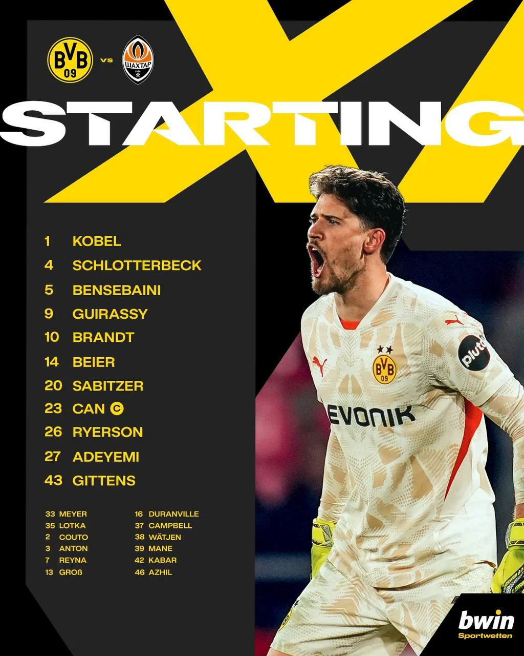 Боруссия Д: Кобель – Рюерсон, Джан, Шлоттербек, Бенсебайни – Брандт, Забитцер, Байер – Байноу-Гиттенс, Гирасси, Адейеми