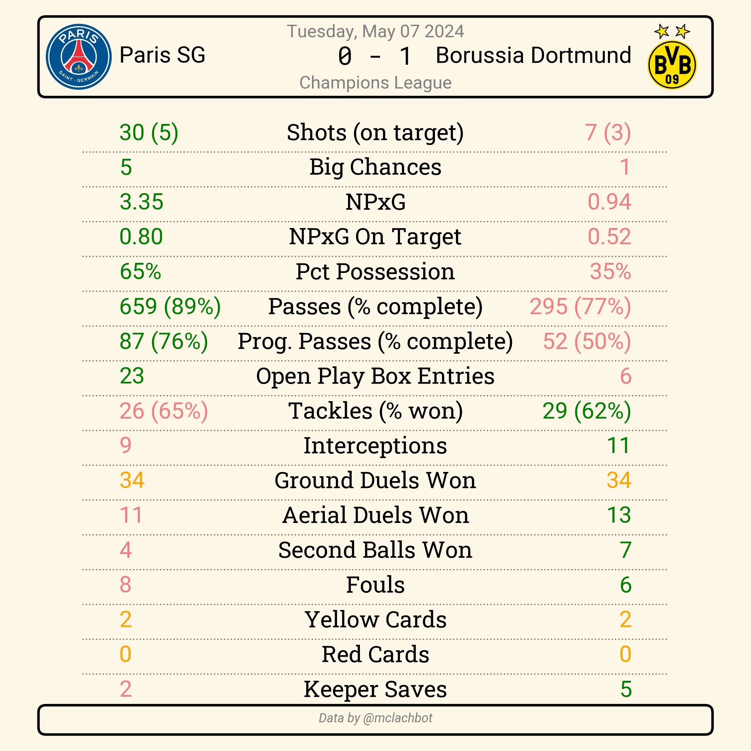 ПСЖ сумел создать давление на дортмундскую оборону, но эта оборона очень солидно держалась. Удивительно видеть, как расхлябанная по сезону Боруссия настолько организованно защищается. Гости читали игру, сохраняли компактный блок и дорабатывали в каждом эпизоде.