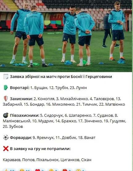 Делегация сборной Украины насчитывает 28 футболистов. Соответственно, главный тренер сборной Украины вынужден был выбрать 5 игроков, которые не попали в заявку на матч в Зенице. Ими стали Александр Караваев, Александр Пихаленок, Даниил Сикан, Виктор Цыганков и Денис Попов, сообщает пресс-служба УАФ.