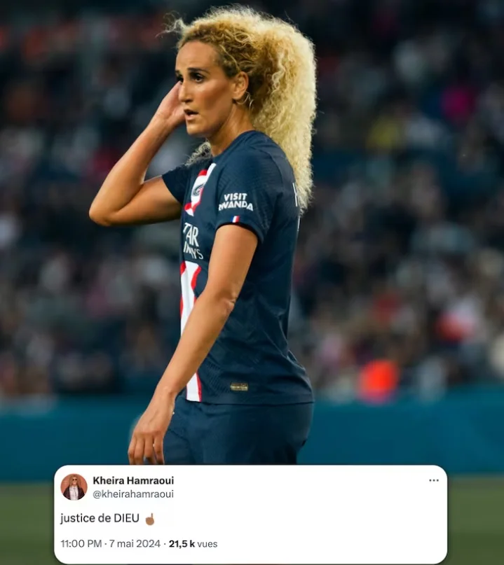 Экс-полузащитница парижан Кейра Амрауи сразу после поражения от Боруссии Д написала в соцсетях: "Божья справедливость". Футболистка вскоре удалила эту публикацию, но скрины не горят.