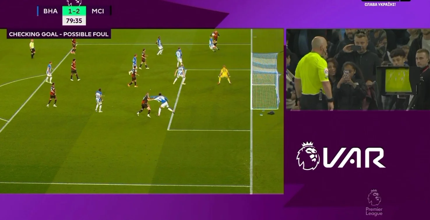 Обе команды играли на победу. Хозяева продолжали искать возможности на быстрых атаках. Мяч после ударов Эступиньяна и Митомы пролетел в считанных сантиметрах от ворот. Манчестер Сити поджимал и в конце концов забил – Холанд выиграл воздух и головой отличился. Однако судья после просмотра VAR зафиксировал фол от Эрлинга, который потянул оппонента за футболку.