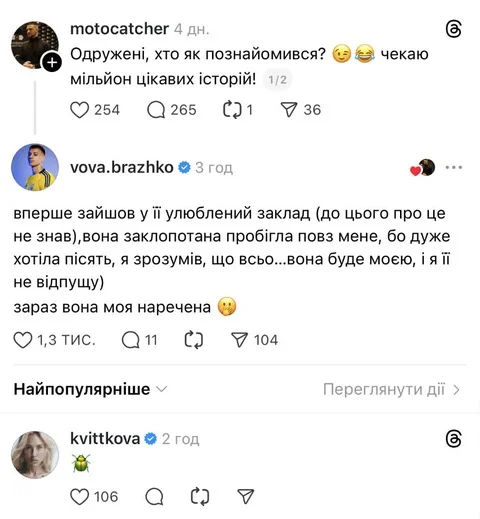 Один из пользователей поинтересовался у женатых, как именно они познакомились со своими половинками, ожидая “миллион интересных историй”. На вопрос откликнулся именно Бражко, который поделился личной историей знакомства со своей возлюбленной – известной блогершей Дарьей Квитковой.