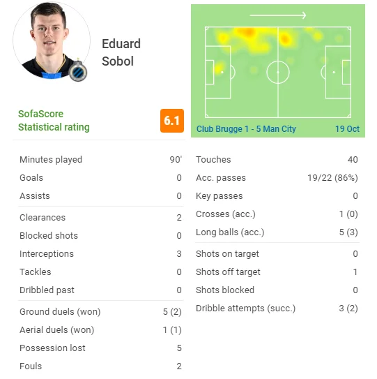 Левый защитник сборной Украины играл против автора дубля Мареза. Там же справа действовал Уокер, который тоже отличился взятием ворот. При этом голы приходили не с непосредственной зоны ответственности Соболя. Свое отыграл честно. Получил высший балл среди основных защитников Брюгге (6,1) от SofaScore. Две удачные попытки дриблинга, удар мимо ворот, 3 нацеленные дальние передачи, только 5 потерь мяча (один из лучших показателей на две команды), впечатляющее хладнокровие под тяжелой артиллерией прессинга, 2 выноса и 3 перехвата (в топ-3 по этим показателям).