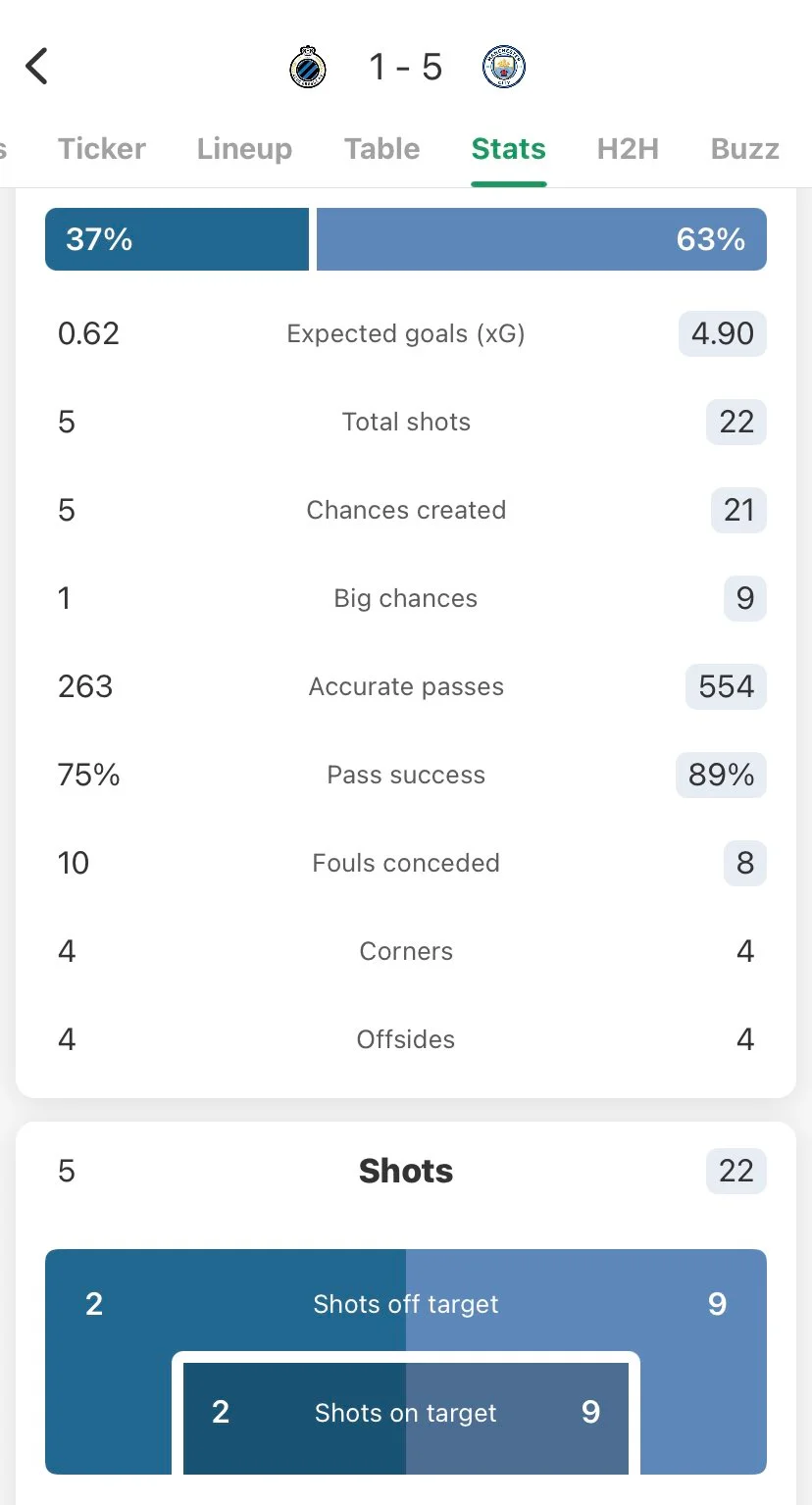 Вышел 19-летний воспитанник клубной академии Палмер, и разницы в качестве никто не заметил. Мог бы дать парочку уроков Стерлингу, который запорол 4 (четыре! за 26 минут!) явных момента. Манчестерцы наиграли на почти 5 голов по метрике xG. Именно столько и забили. По ожидаемым пропущенным 0,62, поэтому итоговые 1:5 показывают вполне реальную картину. Гости создали какое-то просто феноменальное количество стопроцентных моментов (9). Да, у них нет центрфорварда. Зато они крайне опасны своей непредсказуемостью, ведь угроза может прийти отовсюду. Даже бывший опорник Шахтера Фернандиньо за 19 минут успел соорудить прекрасный ассист из глубины поля.