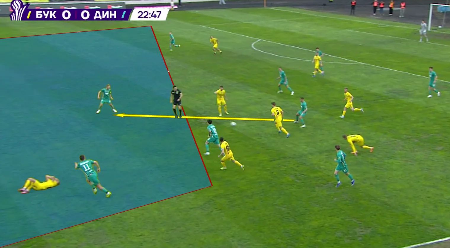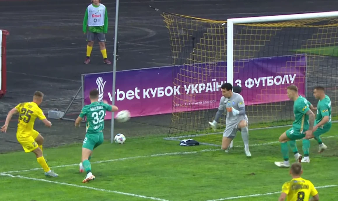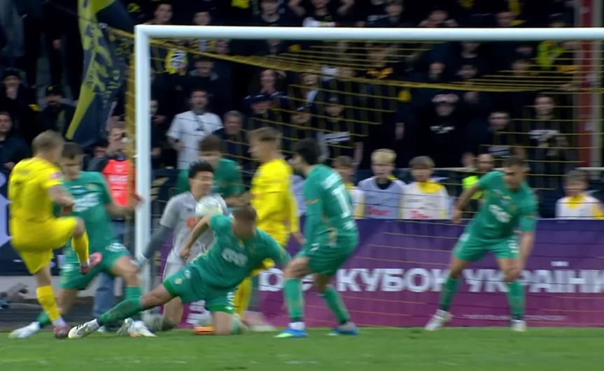 Наказание за превышение рисков прилетело очень быстро. Уже на 23-й минуте киевляне забили гол с контратаки. Вивчаренко отобрал мяч у Пидлепенца и отдал пас в гигантскую дыру в опорной зоне, откуда Буяльский пошел вперед. Буковина получила выпад 4-в-2 – Виталий перевел на Волошина, тот прострелил в штрафную, а Пономаренко замкнул в пустые. За гостями не успел никто.