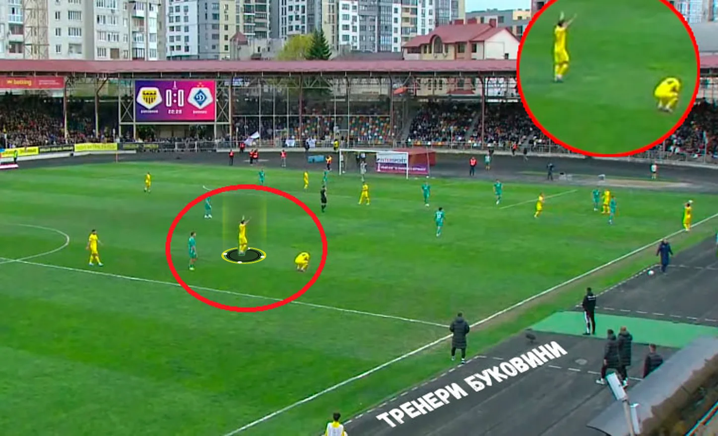Пономаренко стартовал из зоны, в которой лежал центрбек Бусько. Во время атаки Буковины он согнулся, присел на газон, а потом и вовсе лег – и Матвей сразу же подошел к Андрею. Тот сообщил, что все нормально, но нападающий киевлян поднял руку и кричал, чтобы мяч выбили.