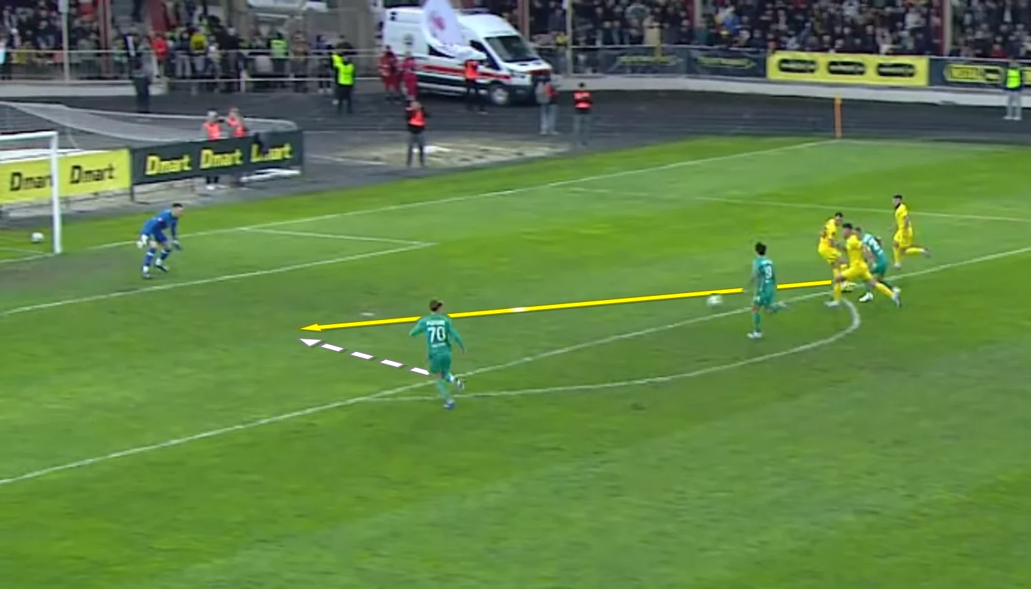 Игроки и тренеры хозяев то ли не слышали подсказок Пономаренко и Прокопчука, то ли не видели состояния своего футболиста. Так или иначе, Безуглый и Ко продолжали играть – и после удачного подбора Никита отдал пас вперед, пытаясь продолжить атаку.