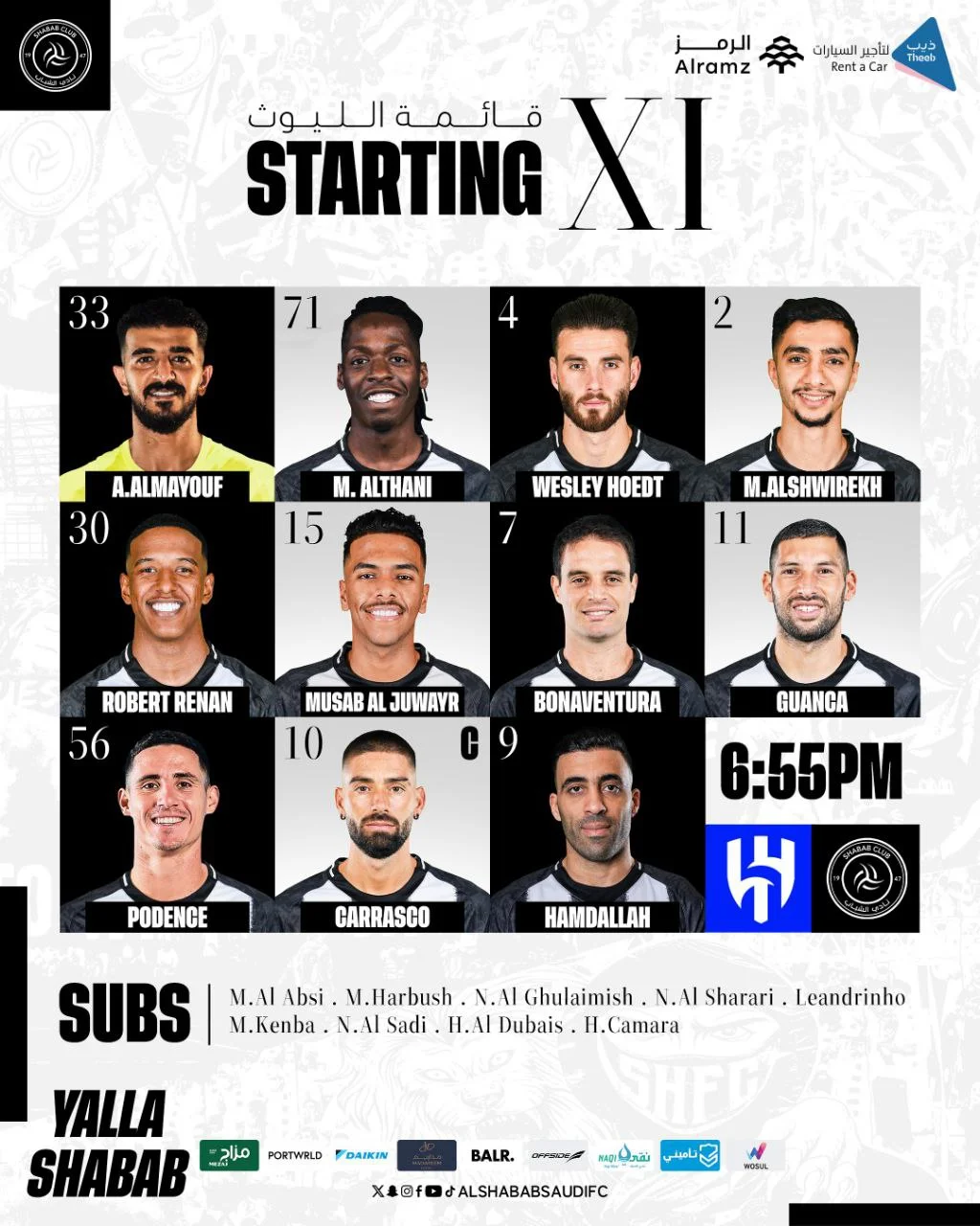 Стартовый состав Аль-Шабаб: Аль-Муаюф – Аль Тани, Аль Швирех, Худт, Ренан – Аль Джувайр, Бонавентура – Поденсе, Гуанка, Феррейра-Карраско – Амдалла.