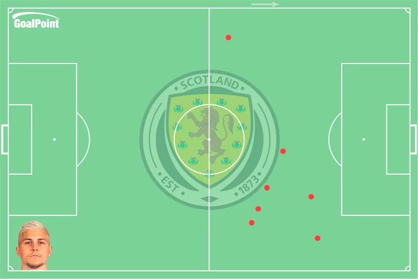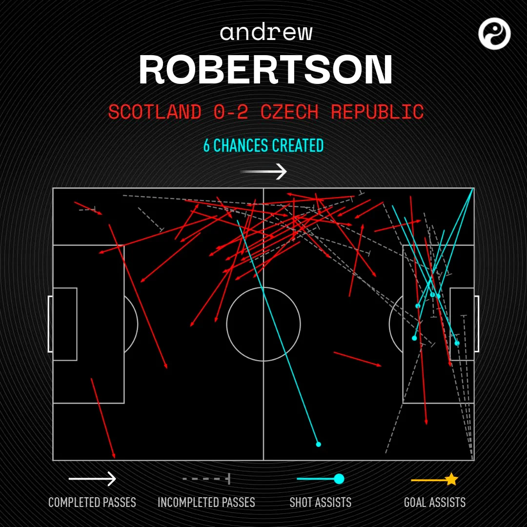 К сожалению, Тирни получил повреждение перед матчем. Робертсон остался без наиболее удобного партнера, но ответственность за результат заставила включать класс. Эндрю продемонстрировал его в всей красоте, став самым острым и наиболее важным футболистом сборной Шотландии в поединке. В его активе – 10 передач на продвижение (лидер матча), 0,69 xT (острота передач, лидер матча), 6 пасов под удар (лидер) и 3 обыгрыша на дриблинге из 4 попыток (лидер). В первом тайме именно он создал первый голевой момент и именно он мог забивать во втором (Вацлик спас).