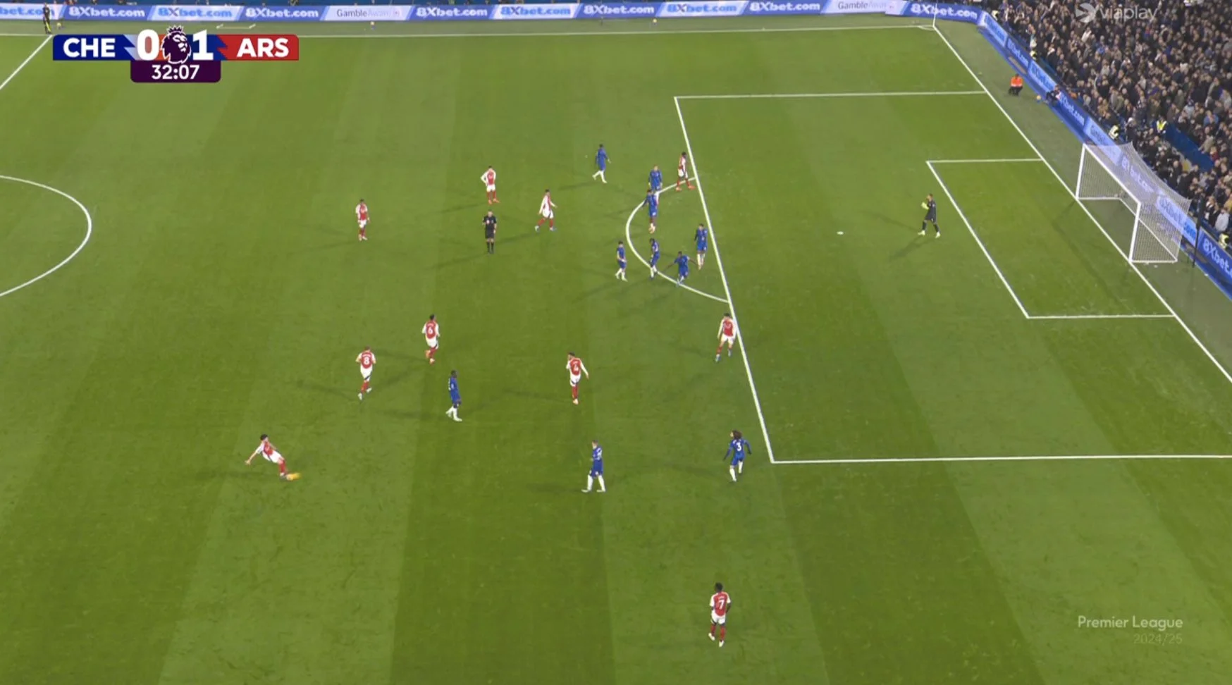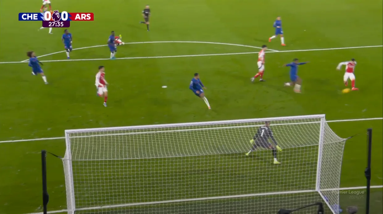 Между тем, Арсенал начал прибавлять в последние 20 минут перед перерывом. В частности, на 27-й минуте прессинг "канониров" вылился в обрезку Колвилла. Сака перехватил мяч и отбросил его Эдегору, а сам побежал открываться на линию полукруга. Удар оттуда заблокировали, однако мяч отскочил на левый край штрафной, откуда мощно пробил Мартинелли – Санчес парировал!