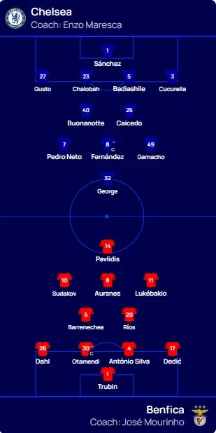 Стартовый состав Челси: Санчес – Гюсто, Чалоба, Бадиашиль, Кукурелья – Кайседо, Энцо Фернандес – Нету, Буонанотте, Гарначо – Джордж.