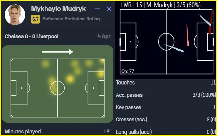 Мудрик вылетел на поле заряженным и влился в общее настроение Челси. Он был активен: искал мяч, предлагал себя, старался обострить и рывками, и передачами. Украинец вывел на дальний удар Энцо. Найти победный гол ему не удалось, однако Михаил отработал неплохо. Как и вся команда. Челси наиграл на победу (3:0 по явным моментам, 1.98xG против 0.35xG по качеству моментов), но в итоге ничья.