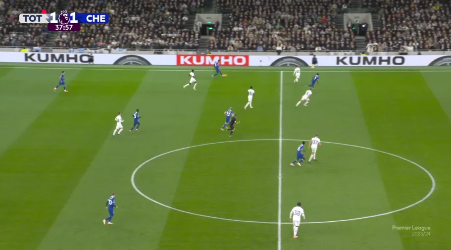 Всё это время Тоттенхэм продолжал работать с очень высокой линией обороны. Даже вдевятером команда не отказывалась от этой тактики. Маурисио Почеттино сразу же решил нажать на эту уязвимость – на 57-й минуте аргентинец бросил в бой Мудрика. Его появление моментально должно было приносить результат.