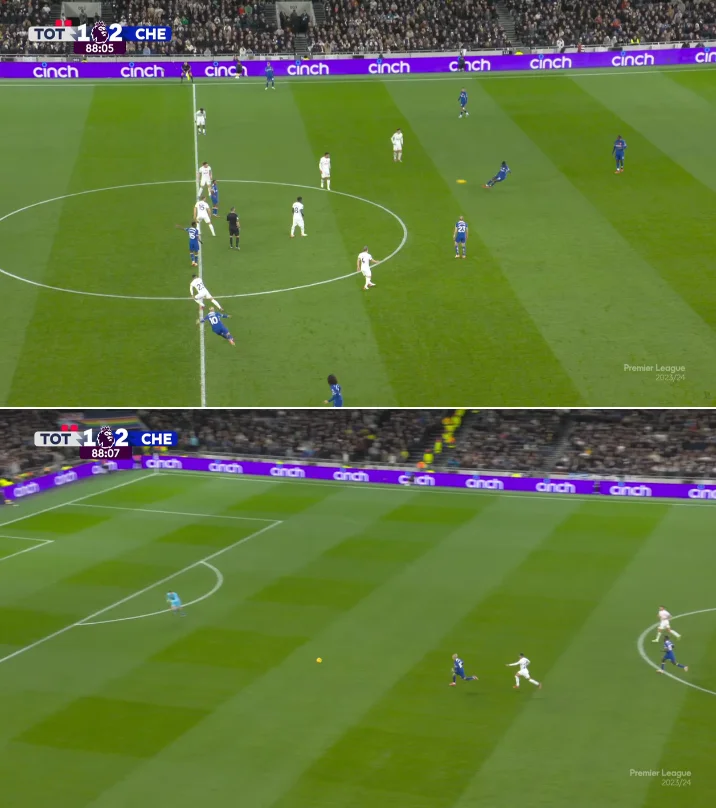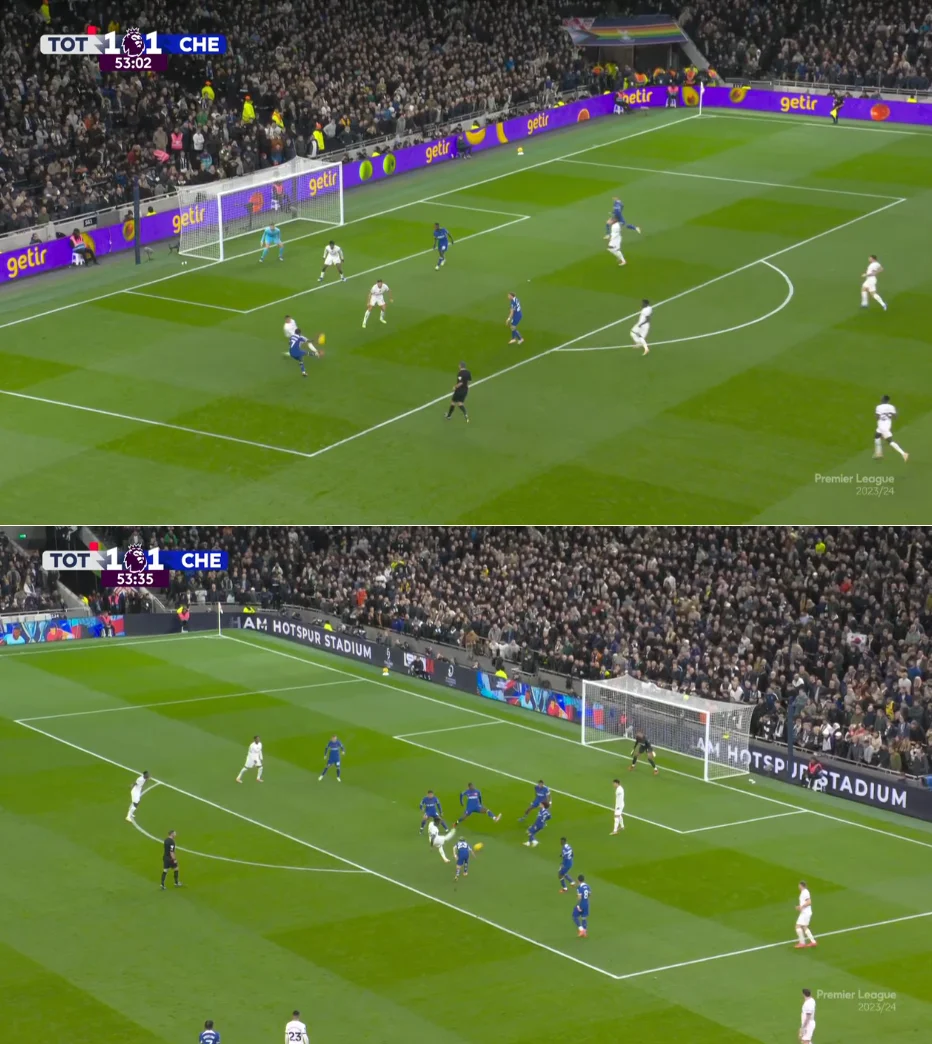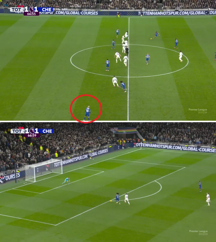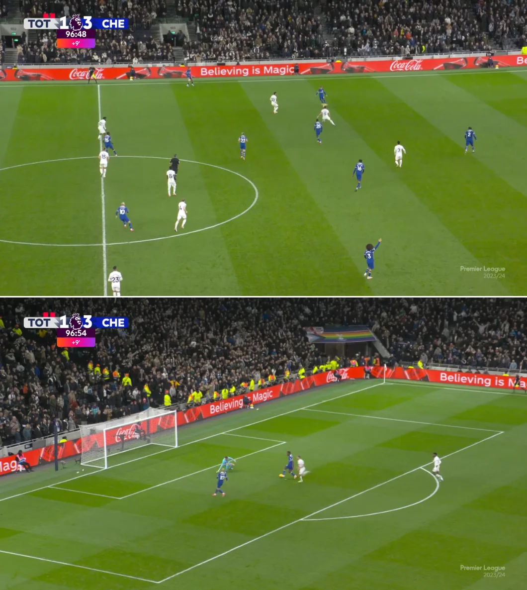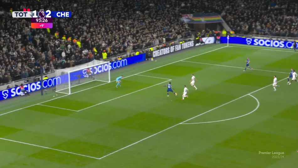 ...а на 7-й он же реализовал выход один на один – 1:4! Этот эпизод примечателен тем фактом, что Николя проявил жадность, не дав отличиться Мудрику. Оба удачно стартовали с центра поля под заброс и оба вышли на рандеву с Викарио, однако Джексон решил завершать эпизод самостоятельно.