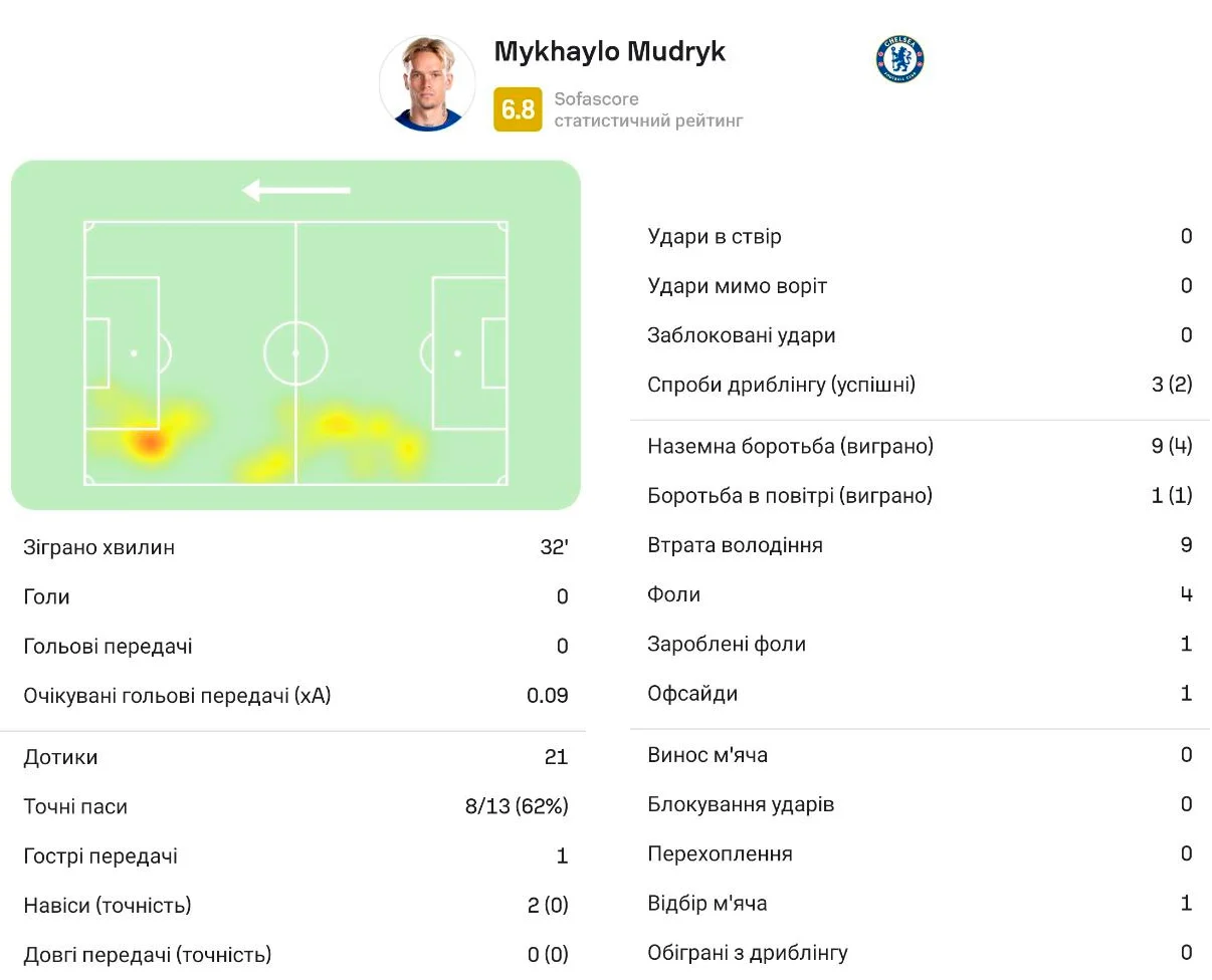 В компенсированное время Мудрик стал более броской фигурой. Он мог и забивать (об этом ниже). На последних же секундах Михаил прорвался на левый край штрафной и выкатил пас под удар Джексону. К сожалению, Николя бахнул по воробьям.