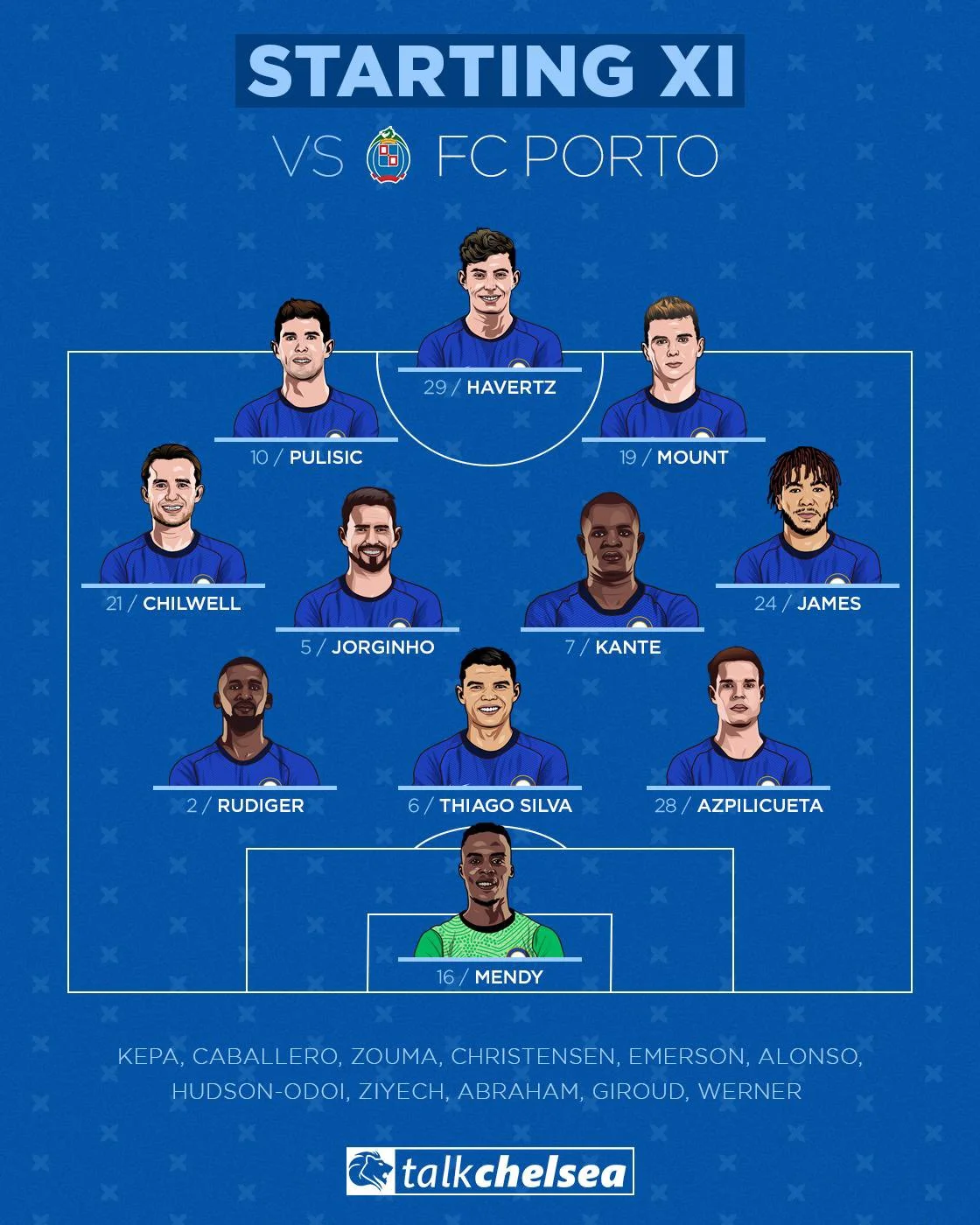 Челси: Мэнди, Аспиликуэта, Тьягу Силва, Рюдигер, Джеймс, Жоржинью, Канте, Чилвел, Маунт, Хаверц, Пулишич