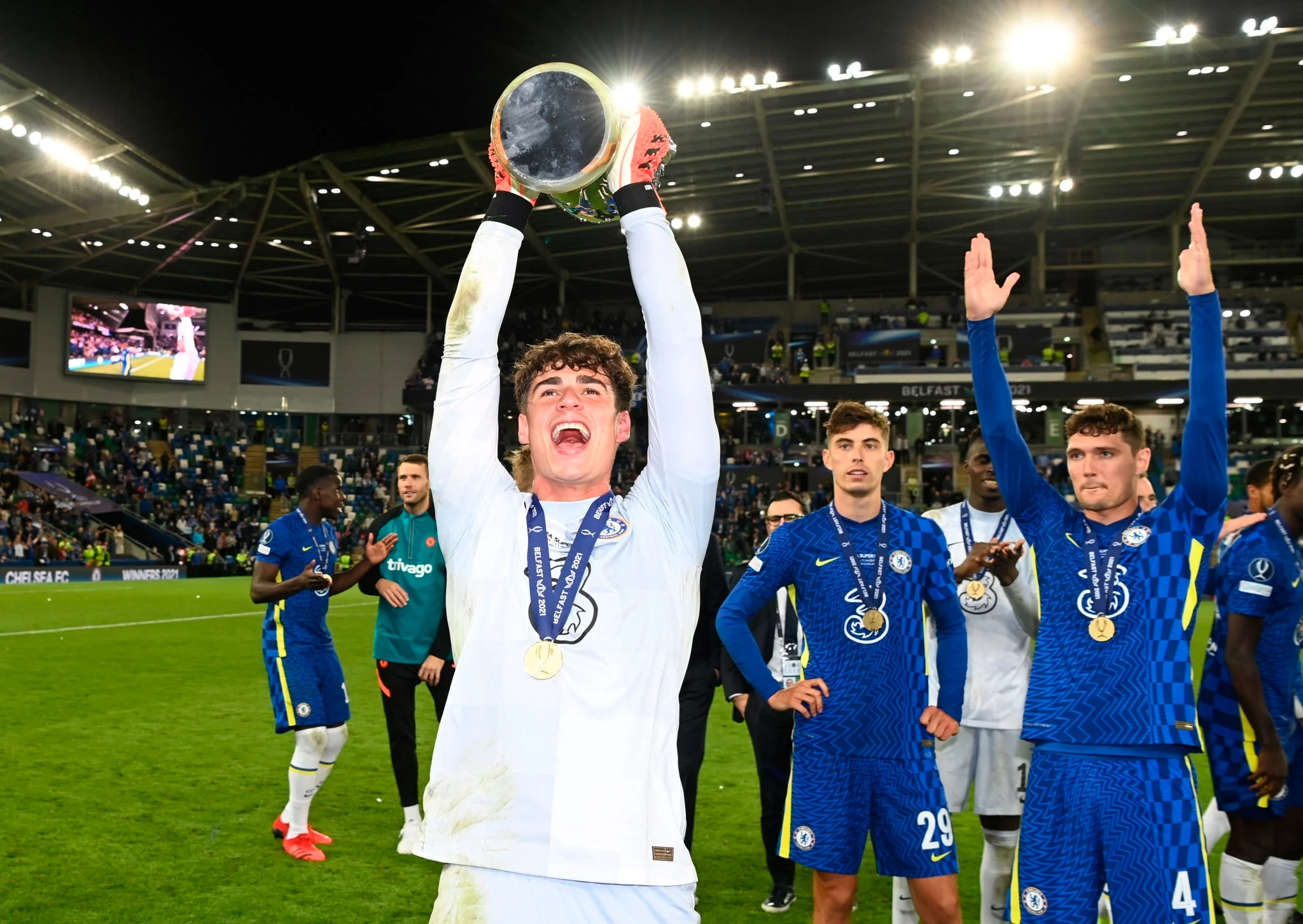 После этого команды обменялись четырьмя подряд точными ударами (отличились Алонсо, Эступиниан, Маунт, Гомес, Жоржинью, Раба, Пулишич и Фойт). Седьмой выстрел от англичан пошёл наносить Рюдигер, который уверенно отличился голом. От испанцев вышел капитан Альбиоль – Кепа что-то ему сказал, а потом парировал удар Рауля! Таким образом, он принёс Челси победу в Суперкубке УЕФА.