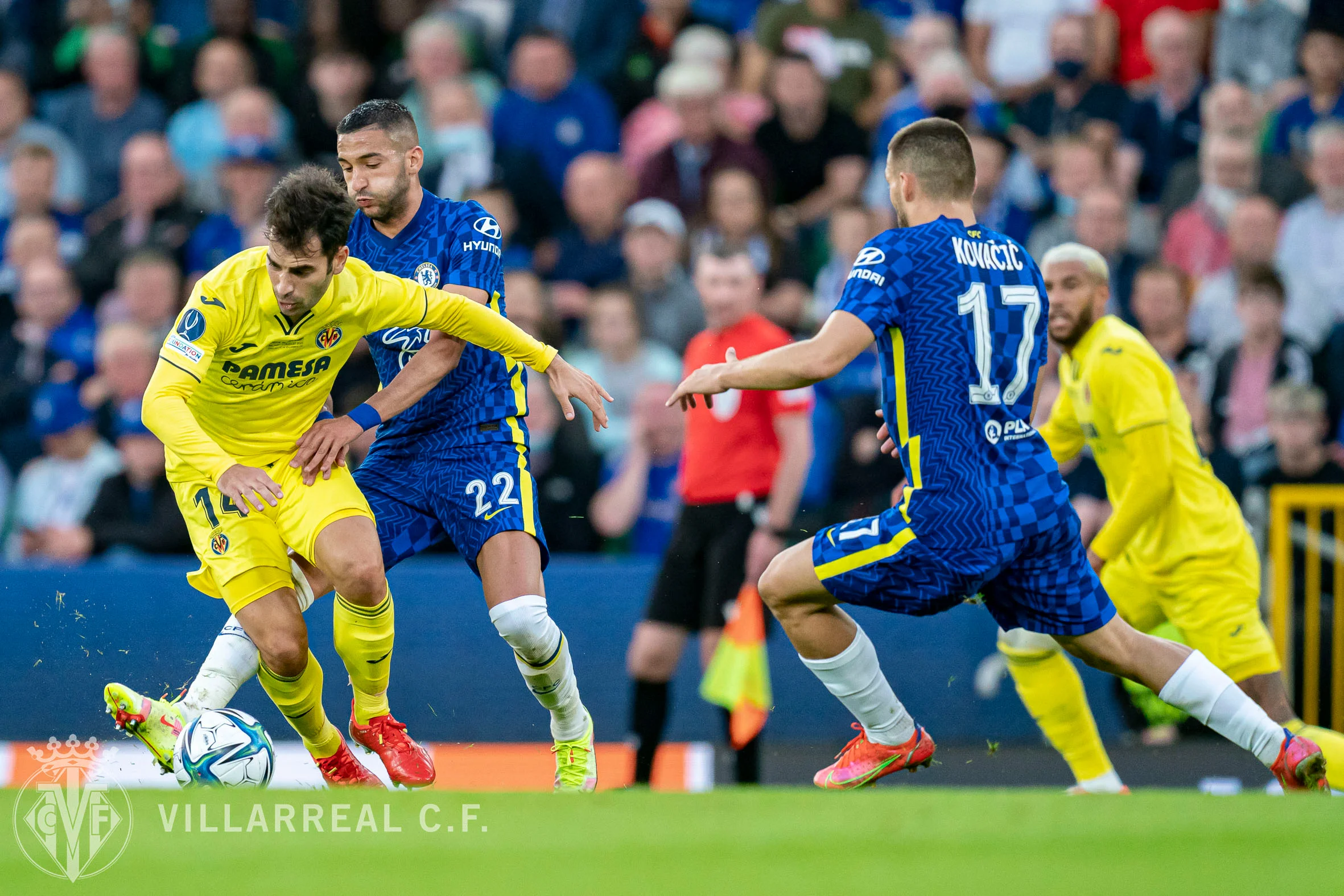 Вильярреал старался отвечать атакой на атаку, завершая их прострелами или зарабатывая фолы. Это не приносило остроты, но помогло выровнять игру в середине первого тайма – Челси продолжал доминировать в нём, но уже без моментов. Впрочем, намёки на голы всё равно возникали в виде прорывов Вернера в штрафную и кучи стандартов. В конце концов, оборона испанцев не выдержала: на 27-й минуте Алонсо исполнил шикарный заброс на ход Хаверцу левым флангом, а тот прострелил на 11 метров под удар Зиешу – Хаким же опередил защитника и замкнул в касание. 1:0!