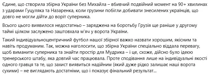 Давайте відверто: якби до початку матчу у Батумі або після того, як рахунок став 1:1 і наша команда помітно посипалась, вам сказали, що Україна не програє, ви б сильно протестували? Розчарування результатом скоріше продиктоване вбивчим моментом імені Полісся вже у компенсований час, коли "синьо-жовті" могли вирвати перемогу, а також загальною ситуацією у нашій групі.