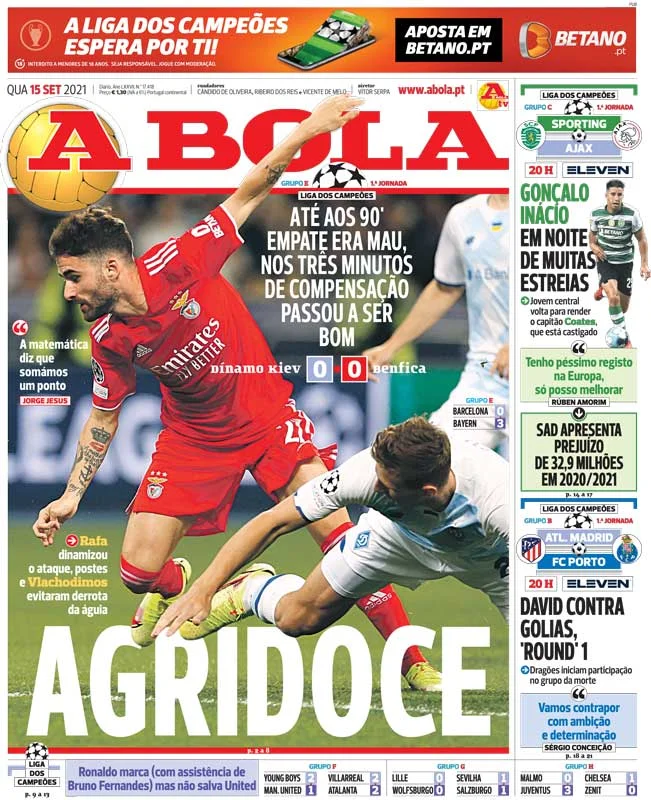 Электронная версия самой популярной спортивной газеты Португалии традиционно ограничилась сухим отчетом. "Орлы" доминировали на протяжении всего матча, Роман Яремчук мог открывать счет перед перерывом, но не забил с близкого расстояния. Но самые яркие эмоции подарило компенсированное время. Шапаренко сначала попал в перекладину, а потом все же замкнул передачу слева, но вмешался VAR. Автор результативной передачи залез в офсайд. К счастью, для Бенфики все завершилось легким испугом. Команда Жезуша больше теряет, чем приобретает. Горько-сладкий дебют в ЛЧ".