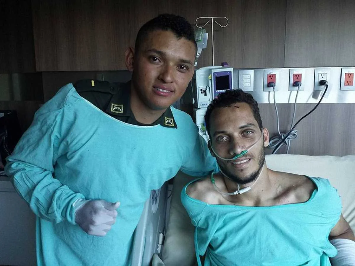 Колумбийский полицейский, участвовавший в спасательной операции после авиакатастрофы "Шапекоэнсе", посетил в больнице защитника бразильской команды Элио Нето.