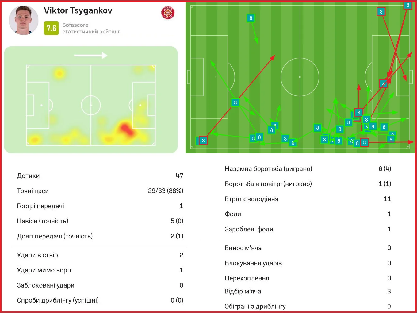 К сожалению, во втором тайме Цыганков перестал быть заметной фигурой. Где-то стоит отметить и адаптацию обороны Райо Вальекано, да и Жирона ощутимо поубавила в активности. Украинец значительно чаще тратил силы в работе в среднем блоке, чем в атаке – хотя на 59-й минуте он помог выбежать в перспективную контратаку (но ее запороли первым же пасом).