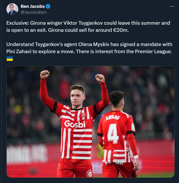 Как сообщает Бен Джейкобс, Виктор Цыганков открыт к переходу из Жироны летом. Клуб может продать его за сумму близкую 20 миллионам евро. Отмечается, что агент украинца Елена Мыскив подписала соглашение с Пини Захави, который представляет Роберта Левандовски и ряд именитых игроков, по поиску вариантов для перехода. Цыганковым интересуются клубы из АПЛ.