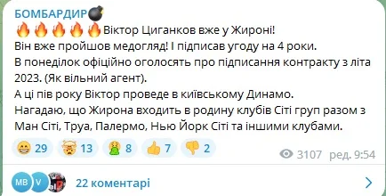 Виктор Цыганков находится в испанской Жироне. Игрок уже прошел медосмотр и подписал контракт на четыре года. Об этом официально объявят в понедельник, 16 января, сообщил Роман Бебех в своем Telegram-канале Бомбардир.