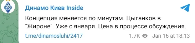 "Концепция меняется по минутам. Цыганков в Жироне. Уже с января. Цена в процессе обсуждения", – говорится в Telegram-канале Динамо Киев Inside.