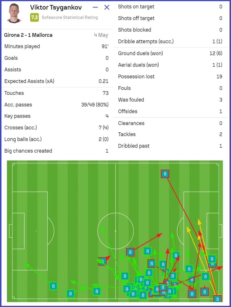 Цыганков продолжал что-либо придумывать, но в штрафной площади оппоненты останавливали его дриблинг и передачи. Пришлось немного поработать без мяча. Виктор дважды удачно сыграл в отборе и выиграл 53% единоборств – хорошие цифры для игрока атаки. Статистические порталы вывели солидные оценки: SofaScore – 7.3, WhoScored – 7.3, FotMob – 7.5.