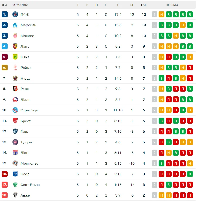 Команда Де Дзерби имеет 13 баллов и находится на второй строчке. Такое же количество очков набрали ПСЖ и Монако. Лион расположился на 14-м месте с четырьмя пунктами.