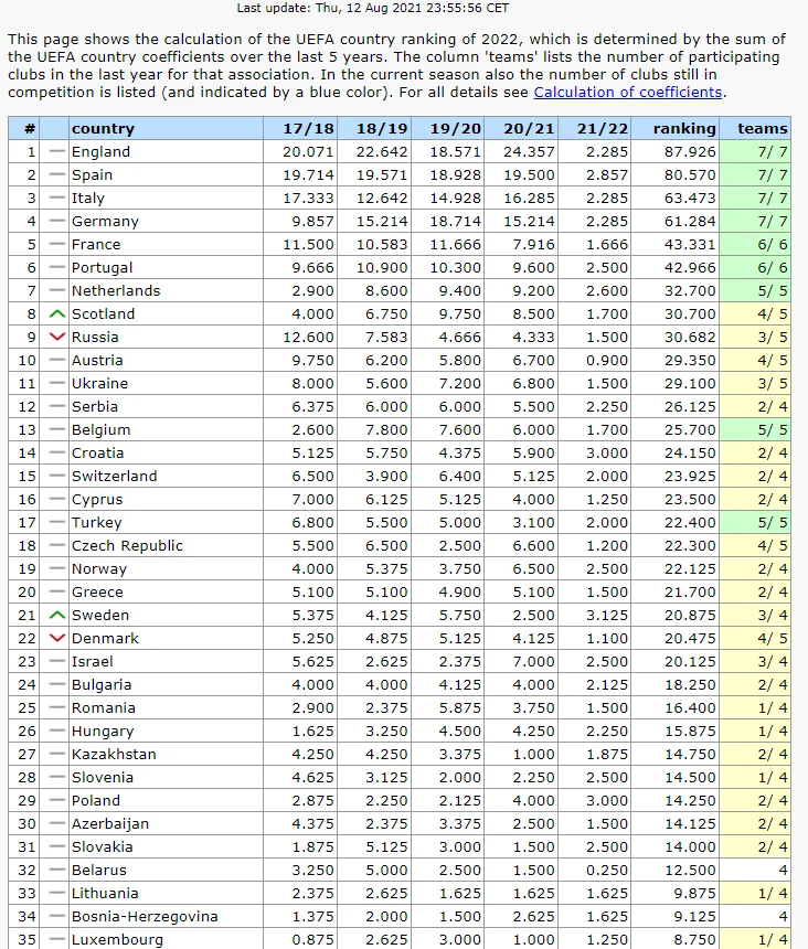 Интересно, что лидером среди украинских клубов является Динамо. Киевляне, еще не стартовав в ЛЧ, уже принесли Украине 4 очка в копилку – это бонус за попадание в групповой турнир Лиги чемпионов. В целом у нас 7,5 балла, но их нужно разделить на 5, потому что именно столько команд стартовало в еврокубках от УПЛ. Как следствие, получаем 1,5 очка. Это не худший показатель, чем у наших прямых конкурентов, которые сейчас стоят выше в таблице коэффициентов: России (1,5) и Австрии (0,9), уже потерявших 3 представителей.