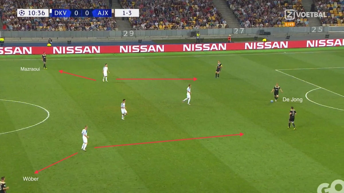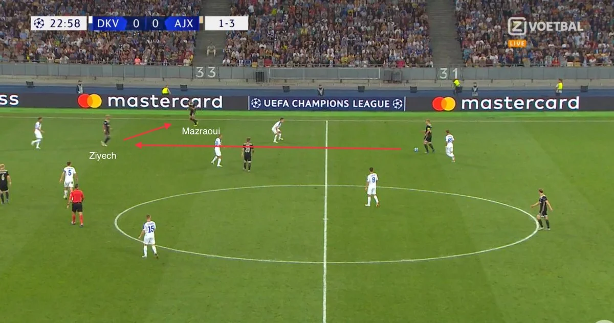 Технічний півзахисник, розташувавшись між Бліндом і де Лігтом, створив для своєї команди більше вільних зон та розв'язав руки крайнім бекам, які піднялись значно вище. Мазраві та Вебер опинились за спинами у хавбеків киян, що змусило їх відтягнутись ближче до середини поля. Все просте – геніальне, чи не так?