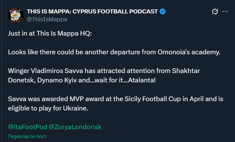 Динамо и Шахтер активно работают на трансферном рынке ради будущего. Как сообщает THIS IS MAPPA, оба гранда заинтересованы в подписании вингера кипрской Омонии U-19 Владимироса Саввы.