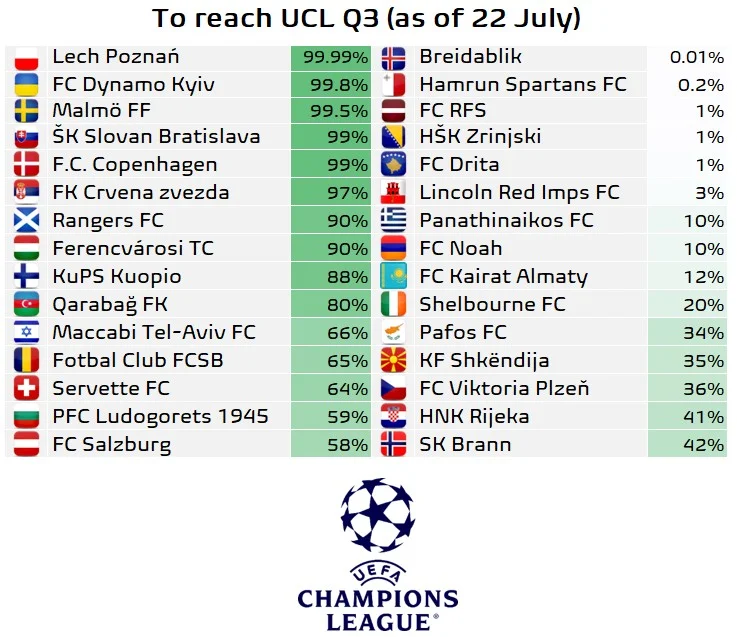 Портал Football Meets Data обнародовал вероятности прохода команд в следующий этап квалификации Лиги чемпионов.