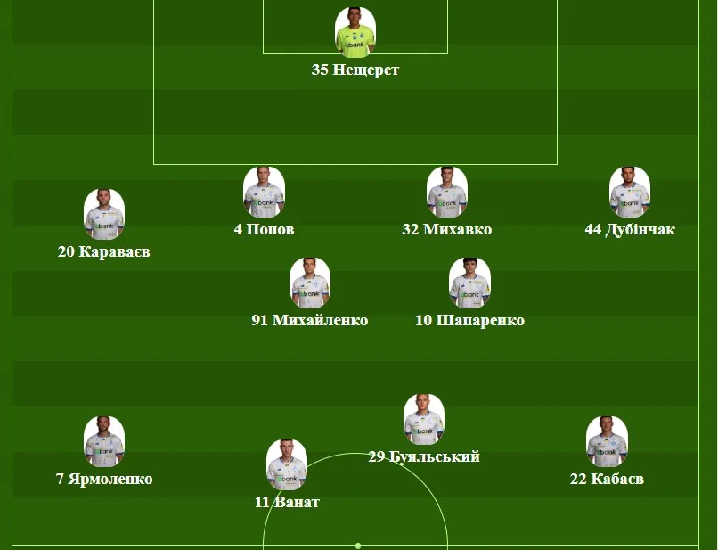 Динамо: Нещерет – Караваев, Попов, Михавко, Дубинчак – Михайленко, Шапаренко – Ярмоленко, Буяльский, Кабаев – Ванат