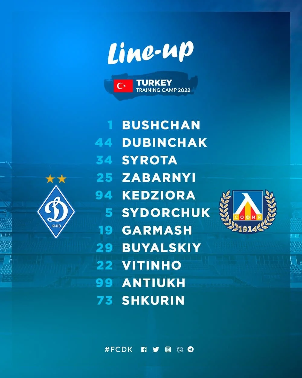 Стартовый состав Динамо: Бущан – Кендзера, Забарный, Сирота, Дубинчак – Сидорчук (к) – Антюх, Гармаш, Буяльский, Витиньо – Шкурин