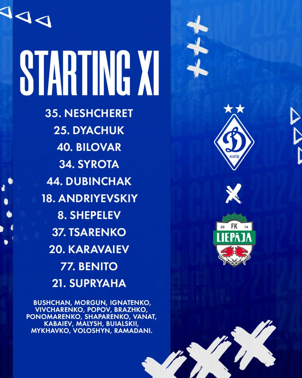 Стартовый состав Динамо: Нещерет – Дячук, Биловар, Сирота, Дубинчак – Андриевский, Шепелев – Караваев, Царенко, Бенито – Супряга.