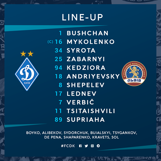 Динамо: Бущан – Кендзера, Забарный, Сирота, Миколенко (к) – Шепелев, Андриевский – Цитаишвили, Леднев, Вербич – Супряга