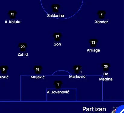 Партизан: Йованович – Де Медина, Маркович (к), Муякич, Антич – Арриага, Гох, Захид – Ксандер, Салданья, Калюлю