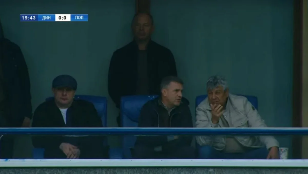 За поединком наблюдают главный тренер сборной Украины Сергей Ребров и экс-наставник Динамо и Шахтера Мирча Луческу. Рядом с ними игру просматривает и еще один экс-тренер Динамо – Олег Лужный.