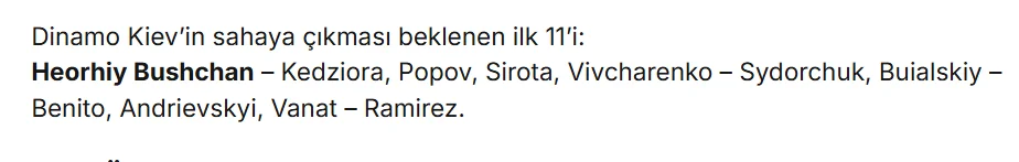 По убеждению турок, в основе киевлян должны появиться Владислав Ванат, который уже успел отличиться за Жирону в чемпионате Испании, Томаш Кендзера, выступающий за ПАОК, а также Георгий Бущан, который является игроком Полесья. Также привлекает к себе внимание "присутствие" в стартовом составе киевлян Сидорчука, Сироты, Андриевского, Бенито и Рамиреса.