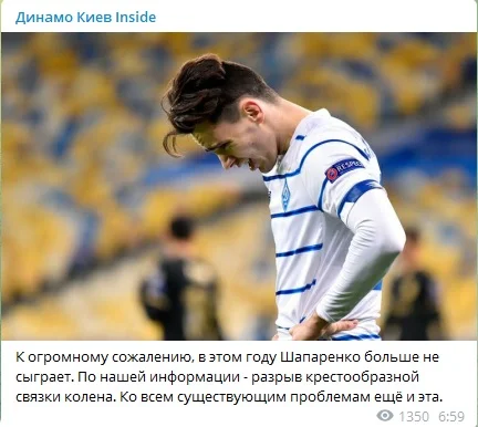 Они оказались безутешными. Полузащитник разорвал крестообразную связку колена. Соответственно 23-летний Шапаренко больше не поможет Динамо в 2022 году, сообщает Динамо Киев Inside.