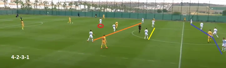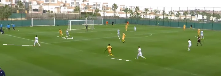 Проте, на мій погляд, у цьому напрямку ще є багато недоліків. Зверніть увагу на велику вільну зону між групою гравців, задіяних у білд-апі, і між групою атаки. Цей простір можна використовувати для передач у недодачу і розвитку швидкої атаки через ці вільні зони, маючи великий простір для взаємодій у ситуації 4 в 4. Інколи захисники трохи перетримували м'яч, а потім використовували довгу передачу у боротьбу.