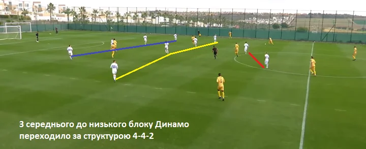 З середнього у низький блок Динамо переходило за структурою 4-4-2. Команда намагалася тримати максимальну вертикальну і горизонтальну компактність у блоці. Було помітно, що це вже не той Буде-Глімт, який восени возив не тільки команду Скрипника, а й Моурінью. Все ж таки потрібен час, щоб нові деталі притерлися до механізму Кнутсена. Та й не потрібно забувати, що це лише перший спаринг Буде на зборах.
